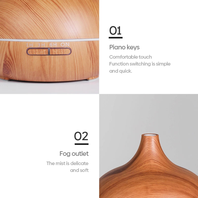 • Wood Grain Texture + Lighting: Featuring a distinctive onion-shaped wood grain finish, this aroma diffuser brings a natural, rustic warmth to your decor. Adjustable LED lighting (warm white, amber, blue, green, and more) complements its organic texture, creating a cozy, nature-inspired ambiance.